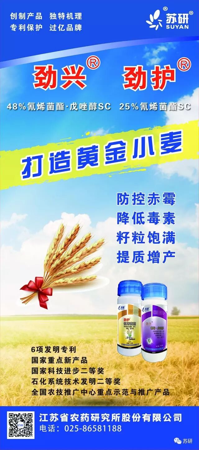 劲护®有效成分氰烯菌酯是江苏省农药研究所股份有限公司自主创制的氰基丙烯酸酯类新型杀菌剂。其作用方式独特,是全球唯一的肌球蛋白抑制剂,是新一类农药杀菌剂,国际杀菌剂抗性行动委员会(FRAC)给予其单独的作用机理和抗性风险分类编码。2017年1~6月江苏省农药研究所股份有限公司氰烯菌酯相关产品销售额已突破1亿元,为小麦、水稻等作物病害防治作出了突出贡献。